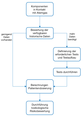 - In einem ersten Schritt werden die mit dem Atemgas in Berührung kommenden Komponenten und deren Materialien bewertet und es wird analysiert, ob genügend relevante Daten zur Biokompatibilität vorliegen.