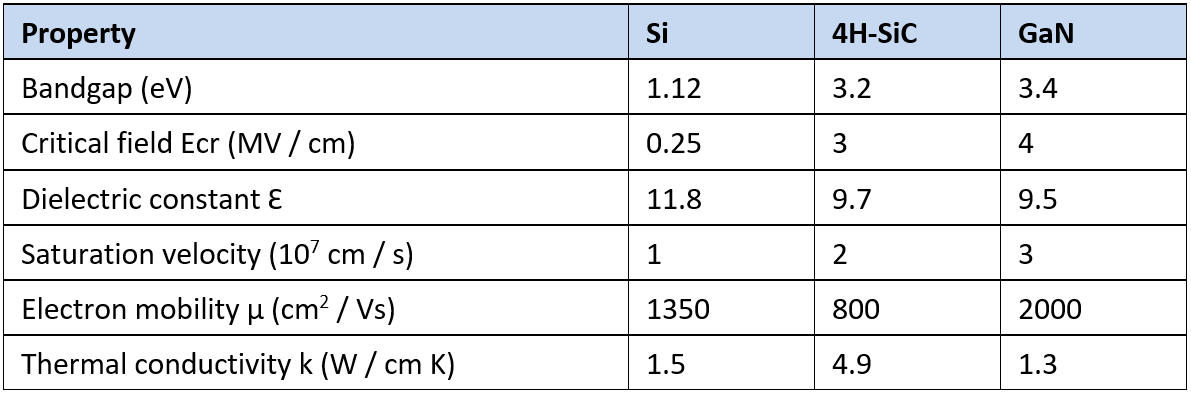 GaN weist im Vergleich zu SiC und Si eine höhere Elektronenbeweglichkeit und Sättigungsgeschwindigkeit auf.
