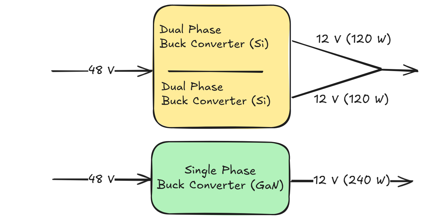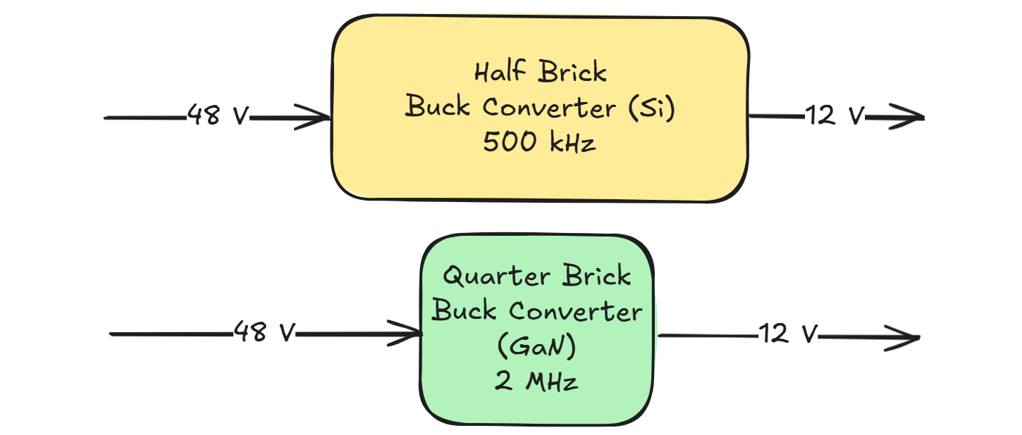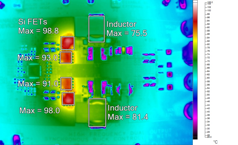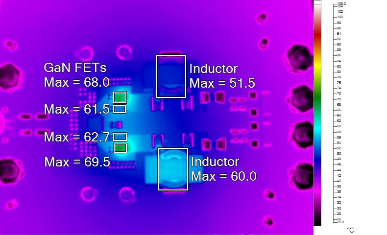 Durch den Einsatz von GaN-FETs können Leistungsverluste deutlich reduziert werden, und es besteht erneut Flexibilität in Bezug auf Ausgangsstrom, Eingangsspannung oder Formfaktor. Tests bestätigten, dass bei Verwendung von GaN-FETs die folgenden Parameter angepasst werden können, um ungefähr die gleiche thermische Belastung wie bei Si-FETs zu erreichen:
