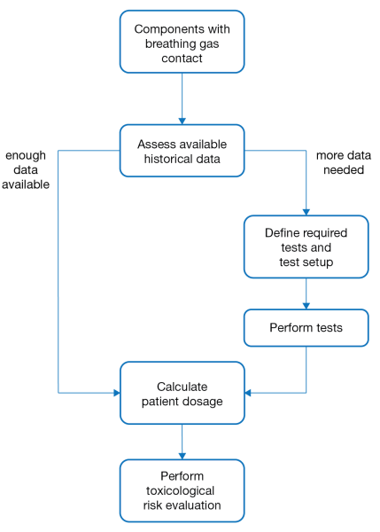 - The first step is to evaluate the components in contact with the breathing gas and their materials and the analysis whether enough relevant biocompatibility data is available.