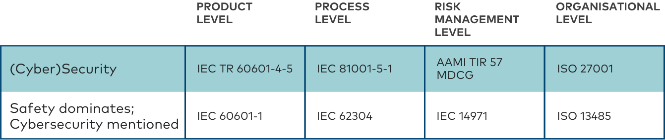 MDCG & IEC 60601-4-5: These focus on the cybersecurity design of systems. They describe security levels that are device-specific and require integration into the entire product development cycle.