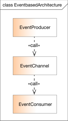 An event-based software consists of the «event producer» and the «event consumer». The event producer creates an event and registers it in the system. He knows neither the reaction to this event nor the event consumer. The event consumer processes one or more events and runs a reaction. The interface between Event-Producer and Event-Consumer can be realized by an implementation of the Publish/Subscribe Pattern (Source). This central piece of software can be called, for example, an «event channel». The event channel knows the events in the system and enables the event consumer to register for certain events. An event is thus detected by an event producer and then reported to the event channel. The event channel informs all event consumers about events to which the respective consumer is registered.