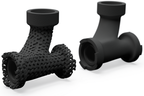 The aim was to minimize the differential pressure and internal volume while keeping material consumption as low as possible. All design versions were additively manufactured and measured in order to validate the best possible solution. The final optimized version was able to reduce the differential pressure by 13% compared to the first version - a clear success for the hybrid development approach of engineering knowledge and generative design. It became clear that the full potential of generative design can only be exploited if the parts are additively manufactured, as this is the only way to implement flow-optimized structures.