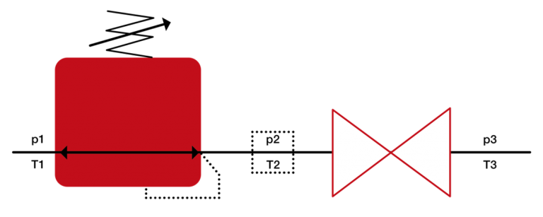 The pressure regulator has input boundary conditions \( p_1 \) and \( T_1 \) and we assume an output boundary pressure \( p_3 \) for the control valve. The output of the pressure regulator (subscript 2) is only ideally constant, but depends on the flow through the system, therefore it is a state of the system.