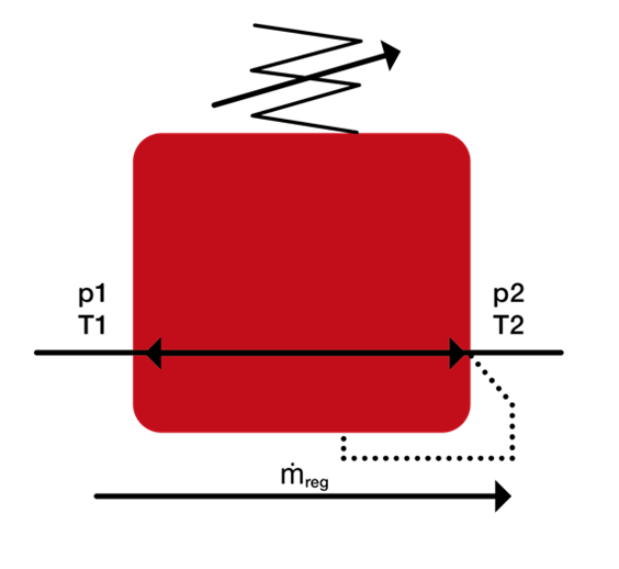 - The mass flows \( {\dot{m}}_{reg}\left(p_1,T_1,p_2\right) \) and \( {\dot{m}}_{valve}\left(p_2,T_2,p_3,\ Hub\right) \) are calculated.