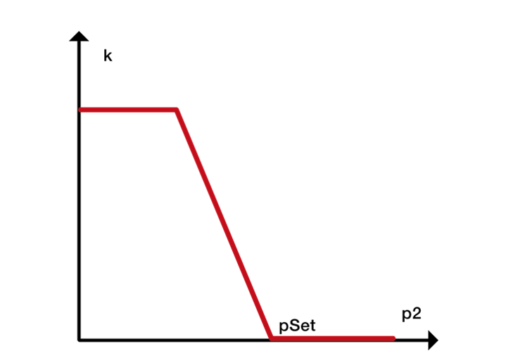 A simple approach to model the pressure regulator is to use the same equations as for the valve, but with \( k\ =\ k\left(p2\right) \) (see Figure 4):