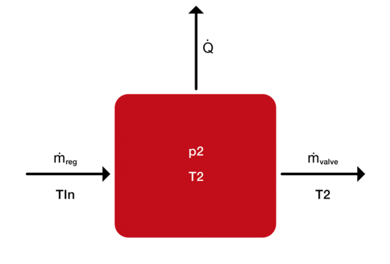 Between the valve and the pressure regulator, there is some piping with a volume that needs to be modeled. It receives flow \( {\dot{m}}_{reg} \) from the pressure regulator and has outflow \( {\dot{m}}_{valve} \) through the control valve (assuming the valve is open and the pressure after the valve is lower). Additionally, energy transfer to/from ambient \( \dot{Q} \) can be included.