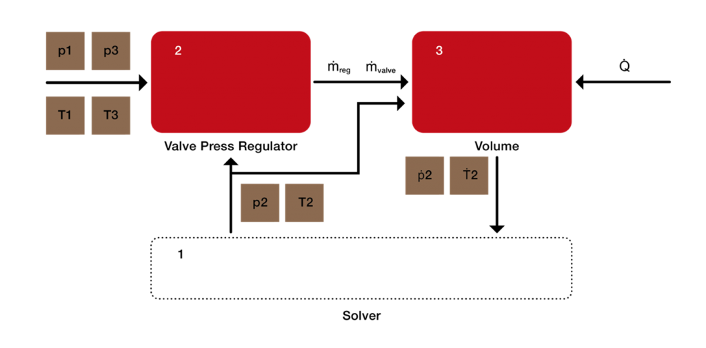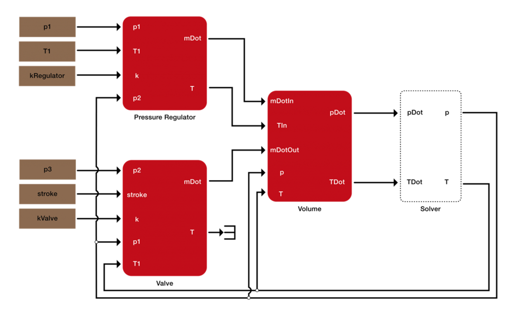 We now have a set of equations that can be solved. The valve and the pressure regulator provide mass flows based on the states and the boundary conditions to the volume, the volume calculates the state derivatives, and the ODE solver can then calculate the new states based on the derivatives. Figure 6 shows the workflow for solving the system.